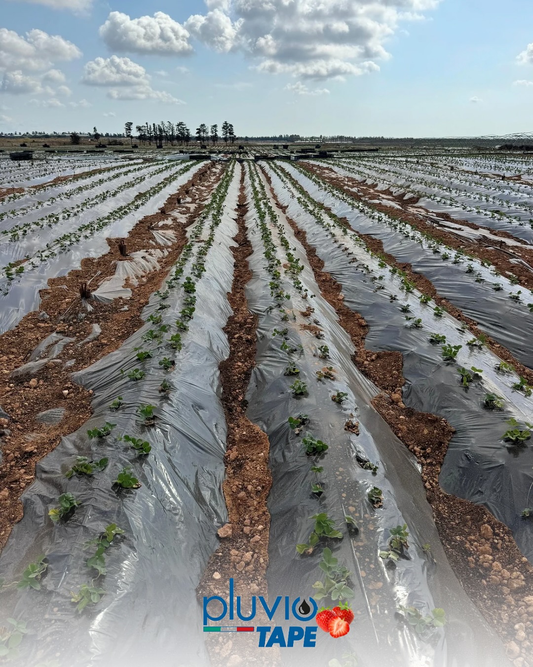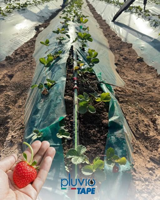 💧Strawberries mulching field with Pluvio Tape dripping hose.