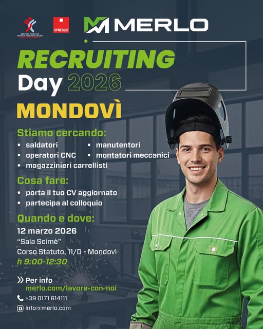 Il 12 marzo 2026 saremo a Mondovì per il Recruiting Day Merlo: una giornata dedicata a chi desidera conoscere da vicino la nostra realtà e sostenere un colloquio direttamente con il team HR e quello di Synergie