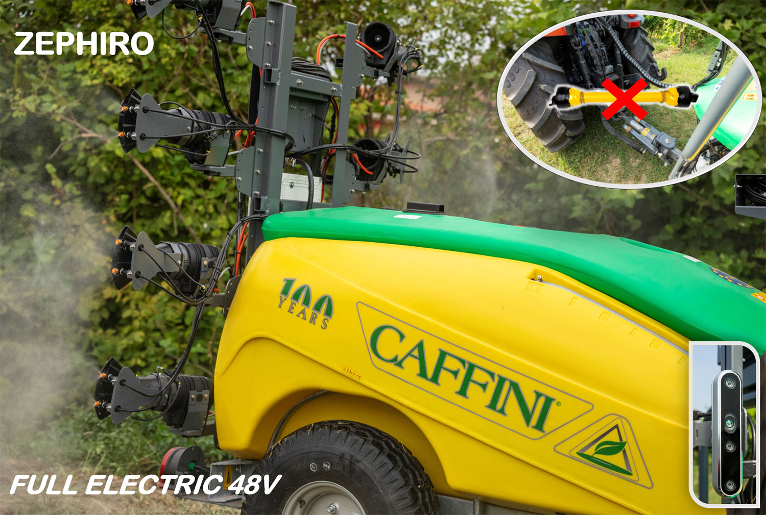 In cosa consiste l’innovazione: l'irroratrice è completamente elettrica e presenta otto ventilatori, ciascuno dei quali è dotato di due ugelli PWM. Ha anche un sistema di visione artificiale con AI e comunica con il trattore tramite protocollo ISOBUS.