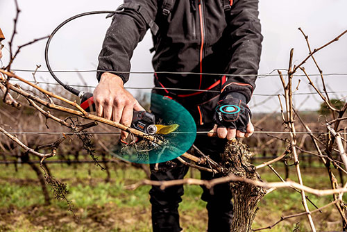 Forbice da potatura e guanto con dispositivo di trasmissione e ricezione di campi elettromagnetici ad alta frequenza per evitare il rischio di taglio.