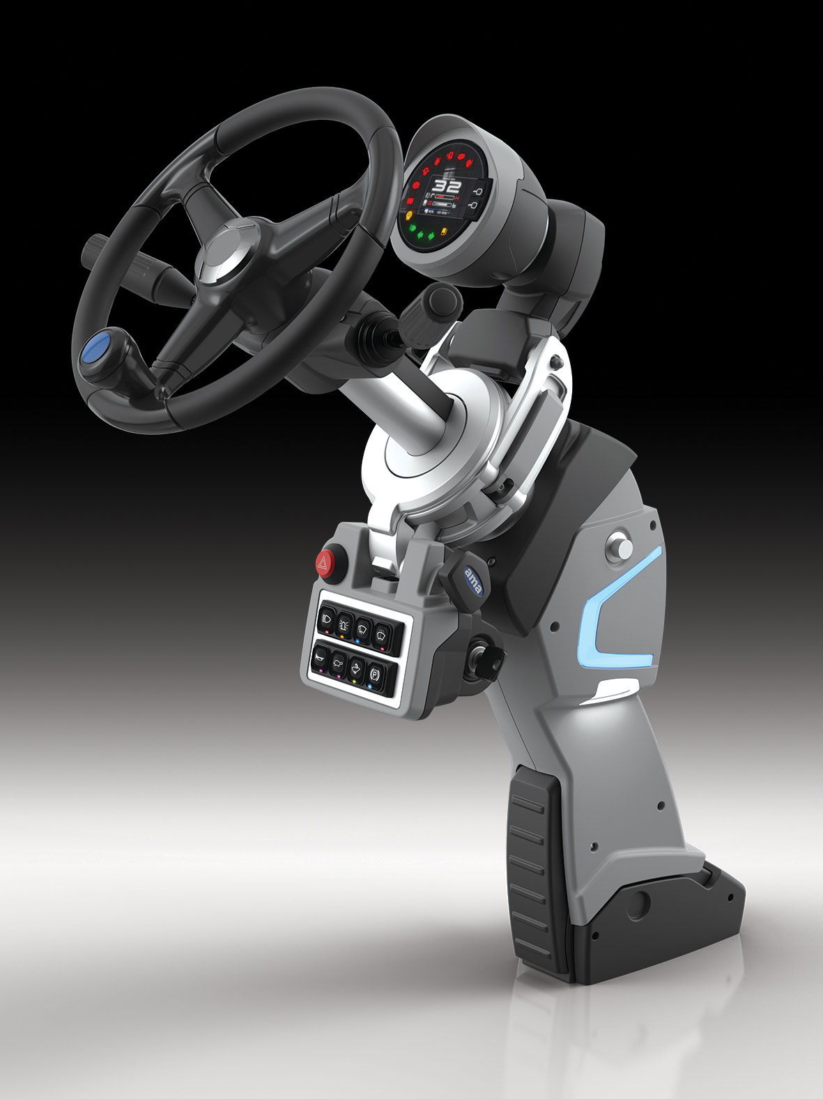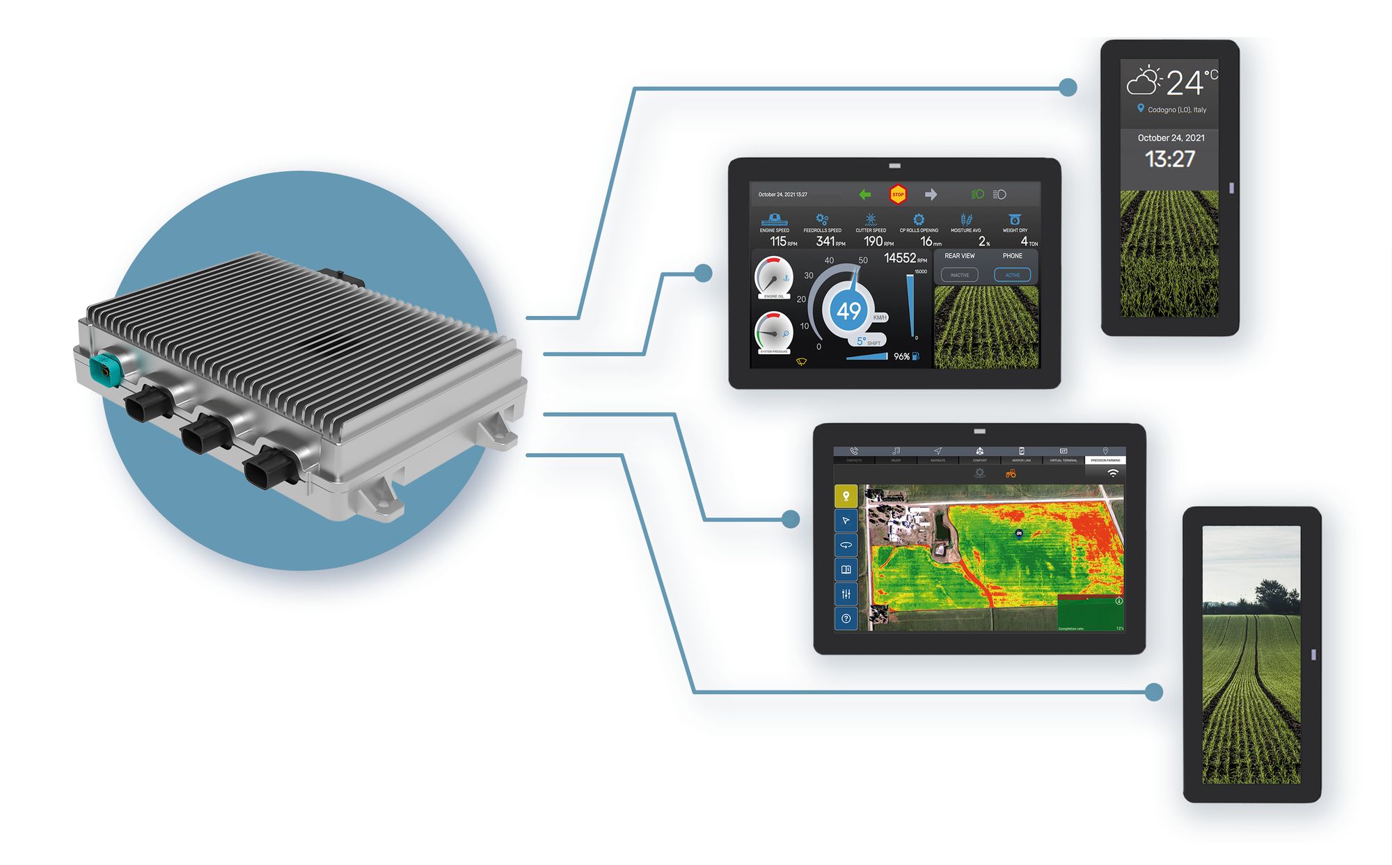 Sistema HMI primario tra l'operatore e l'elettronica del trattore. È costituito da un'unità principale elettronica di controllo e da pannelli TFT separati.