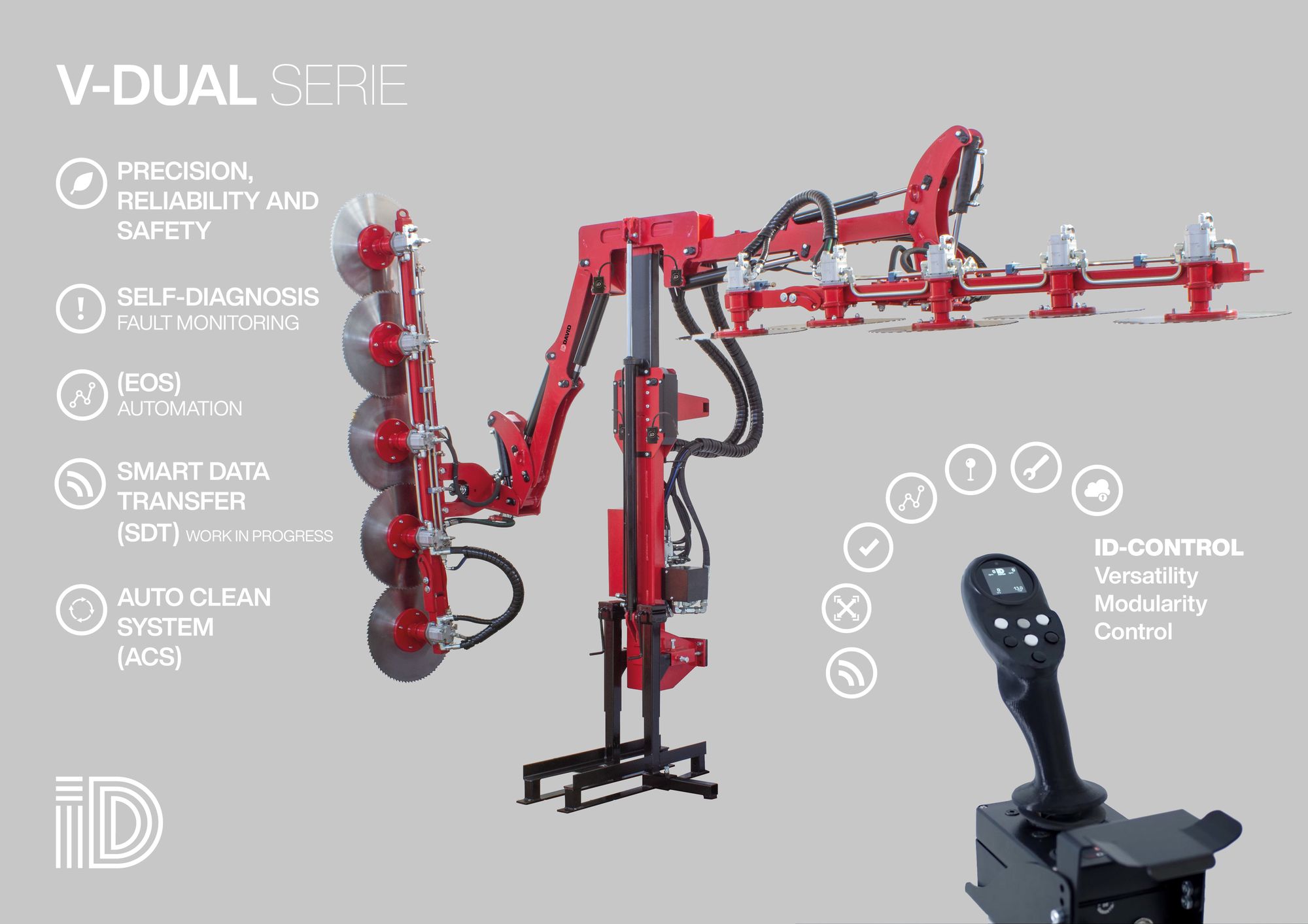 In cosa consiste l’innovazione: sia nella possibilità di lavorare su due file differenti in un unico passaggio, sia nelle caratteristiche del sistema di controllo. Questi ultimi consentono di monitorare lo stato di molti parametri su un display posto sul joystick, in modo che i principi dell'agricoltura digitale possano essere applicati anche in assenza di un moderno trattore.