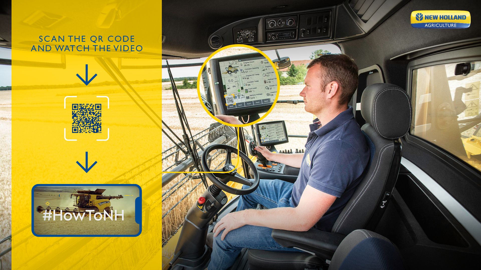 Codici QR integrati a pagine specifiche del monitor di una mietitrebbia, che consentono di accedere a video didattici correlati.