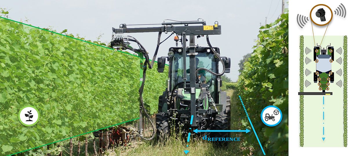 Trattrice per frutteto e vigneto con sistema di guida automatica ad ultrasuoni.