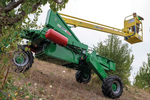 Piattaforma di lavoro elevabile a braccio, semovente e autolivellante, per le operazioni in frutteto.